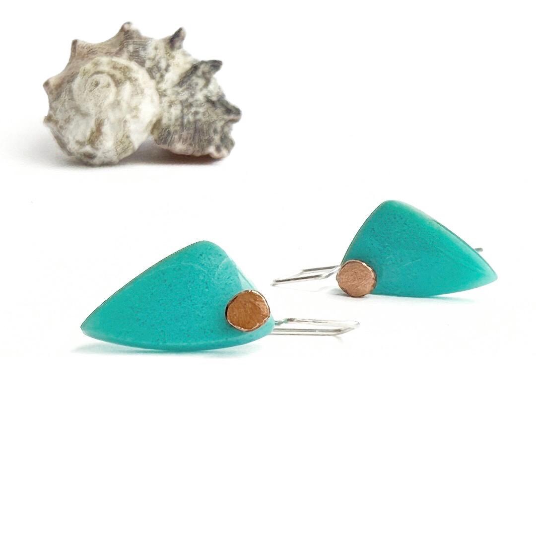These one-of-a-kind earrings feature freeform slices of rare blue wood opal, showcasing a luminous turquoise-like hue and a smooth, nicely polished finish. Each blade-like stone is naturally unique, offering subtle variations in color and grain that speak to its organic origins. The opal slices are simply suspended from my hand-forged sterling silver “button” ear wires, accented with tiny 5mm copper dots—creating a refined and earthy contrast that enhances their natural elegance.