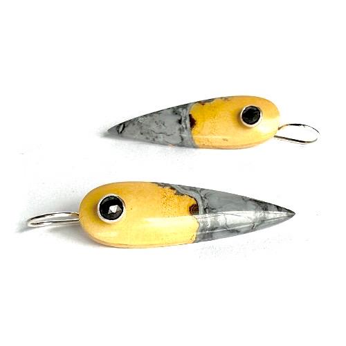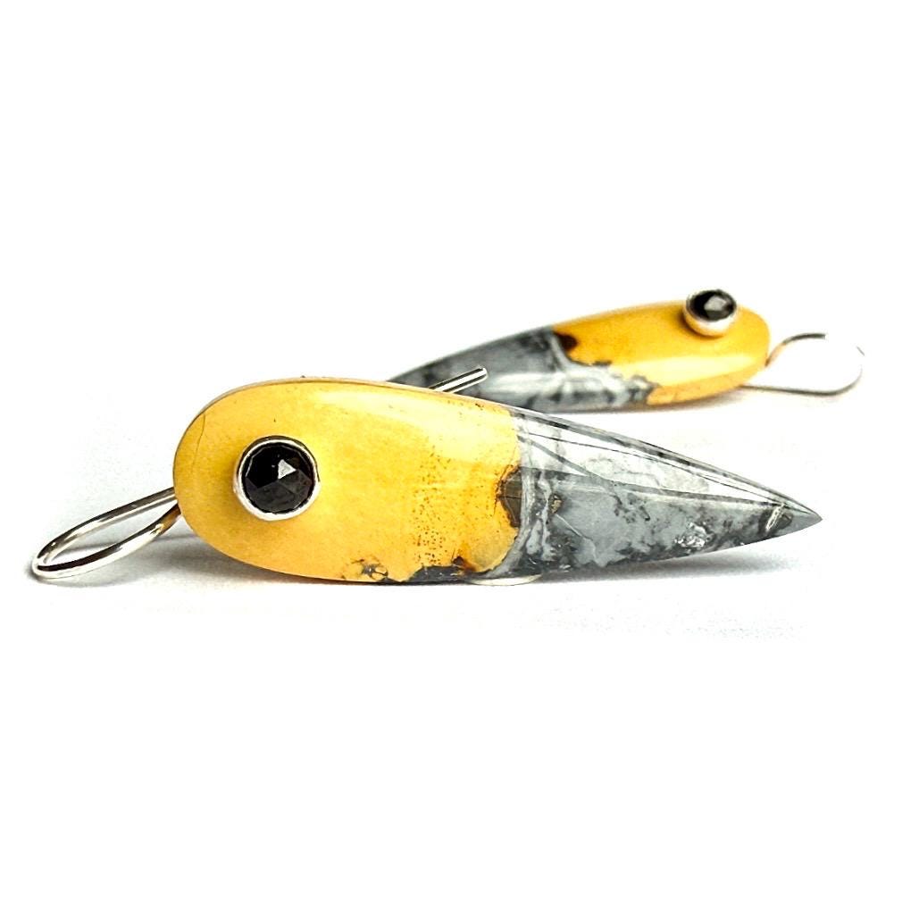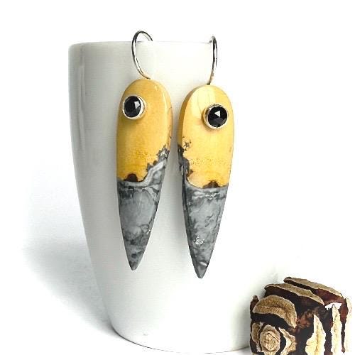 These one-of-a-kind earrings feature polished reversed teardrops of Maligano Jasper, showcasing dramatic color contrasts that evoke the beauty of smoke and flame. The stones display rich golden yellow and deep charcoal gray hues, with darker tones pooling at the tips like rising smoke, creating a moody, elemental feel.