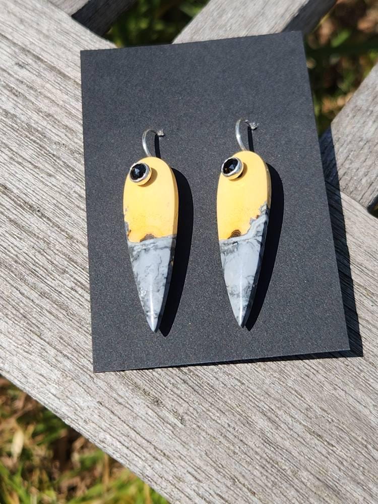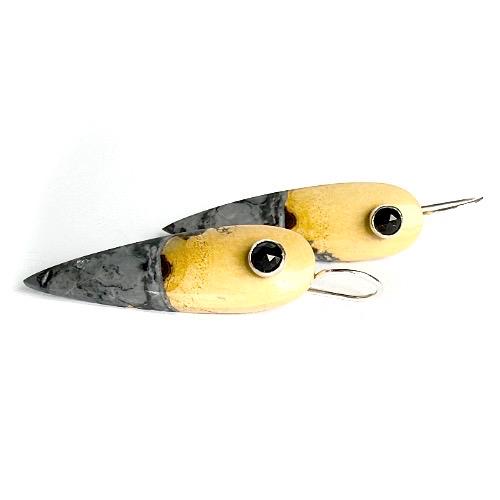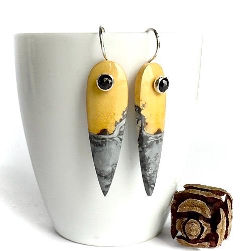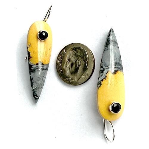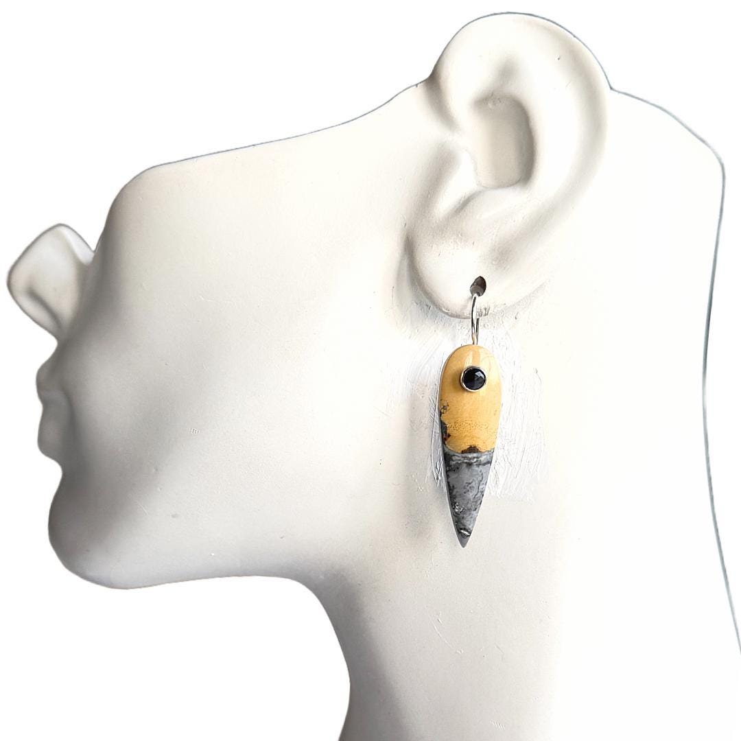 Each stone is suspended from my hand-forged sterling silver “button” ear wires and accented with tiny 4mm faceted black spinel dots for a subtle flash of light and a touch of edge. Measuring approximately 1-3/4 inches long by 1/2 inch wide, these lightweight earrings make a bold yet wearable statement.