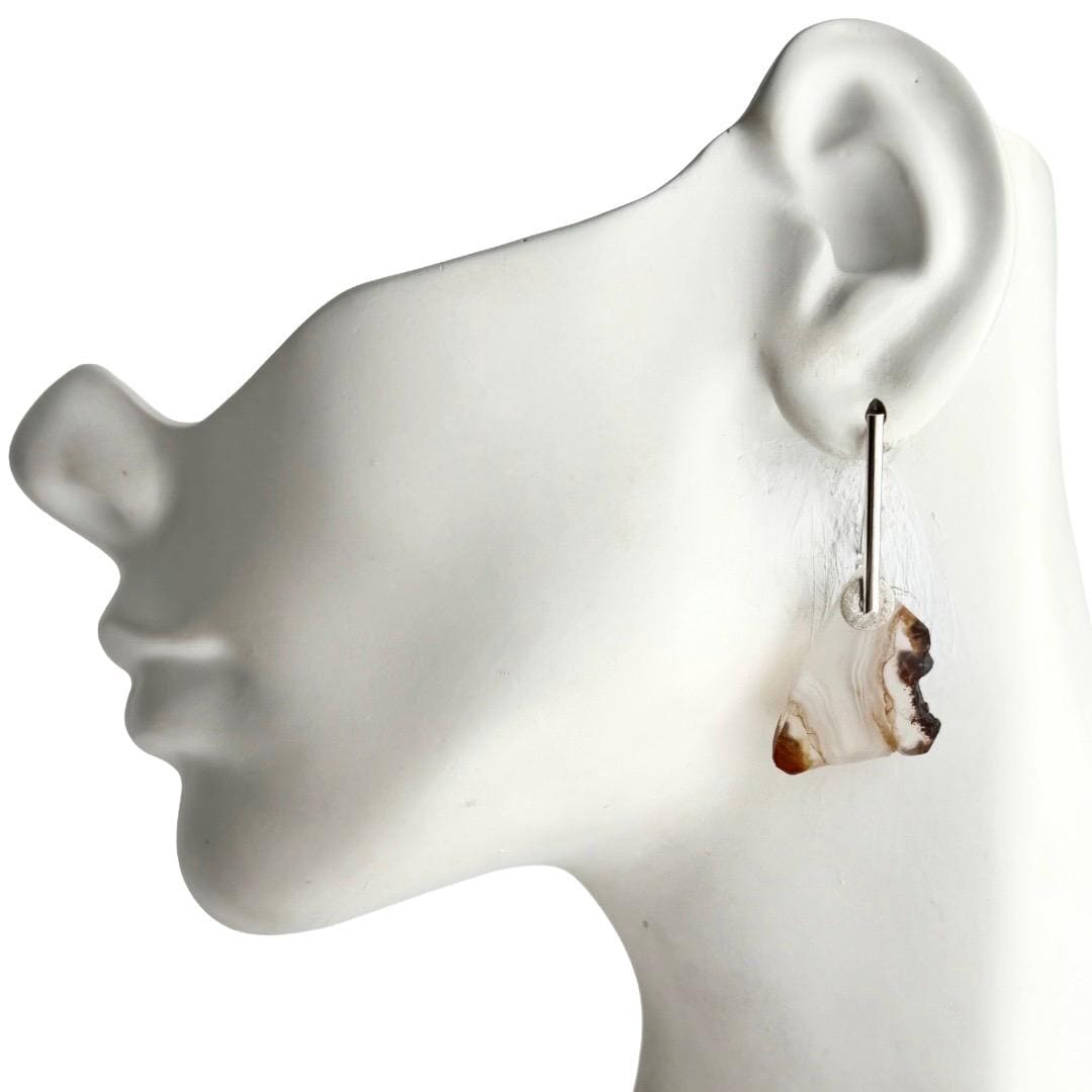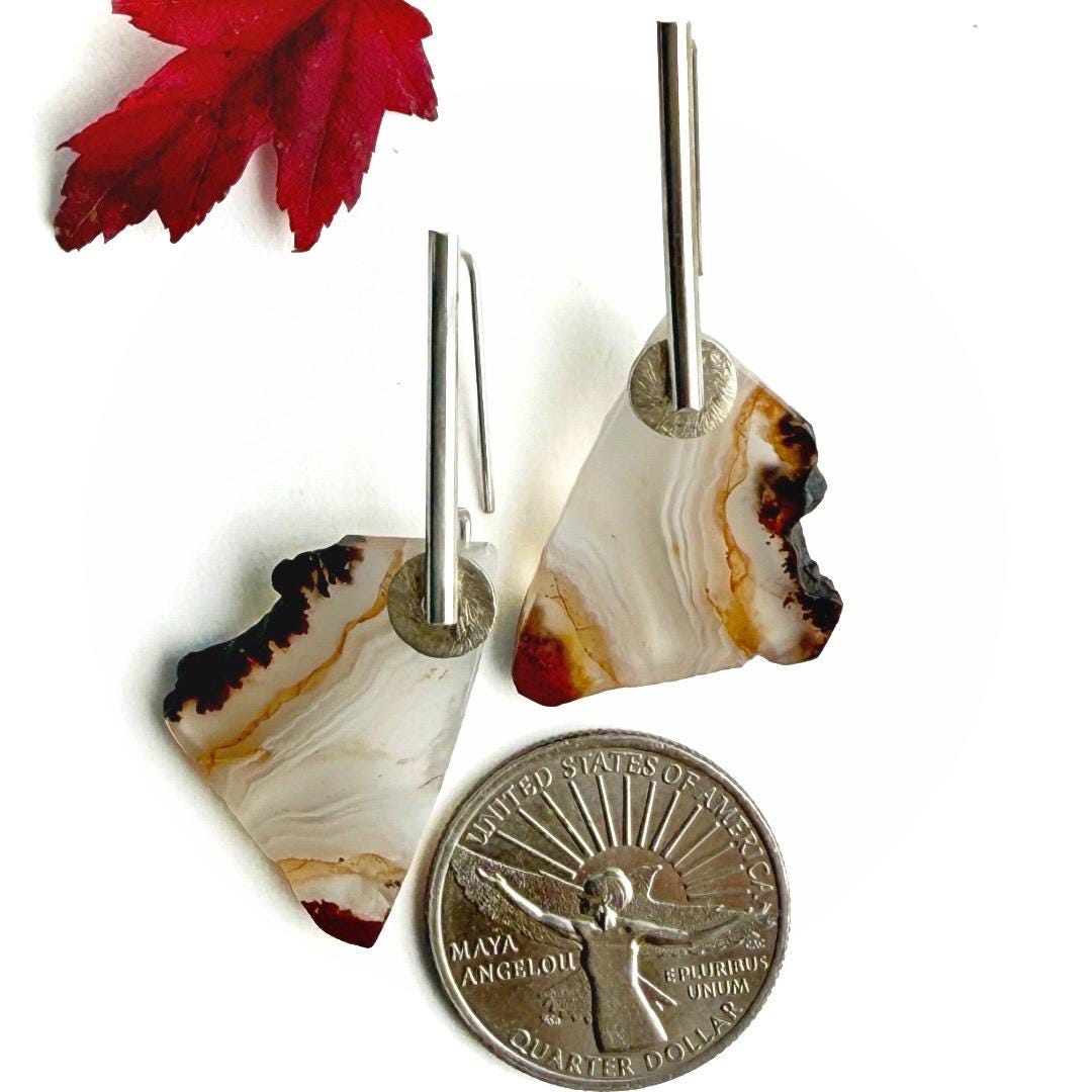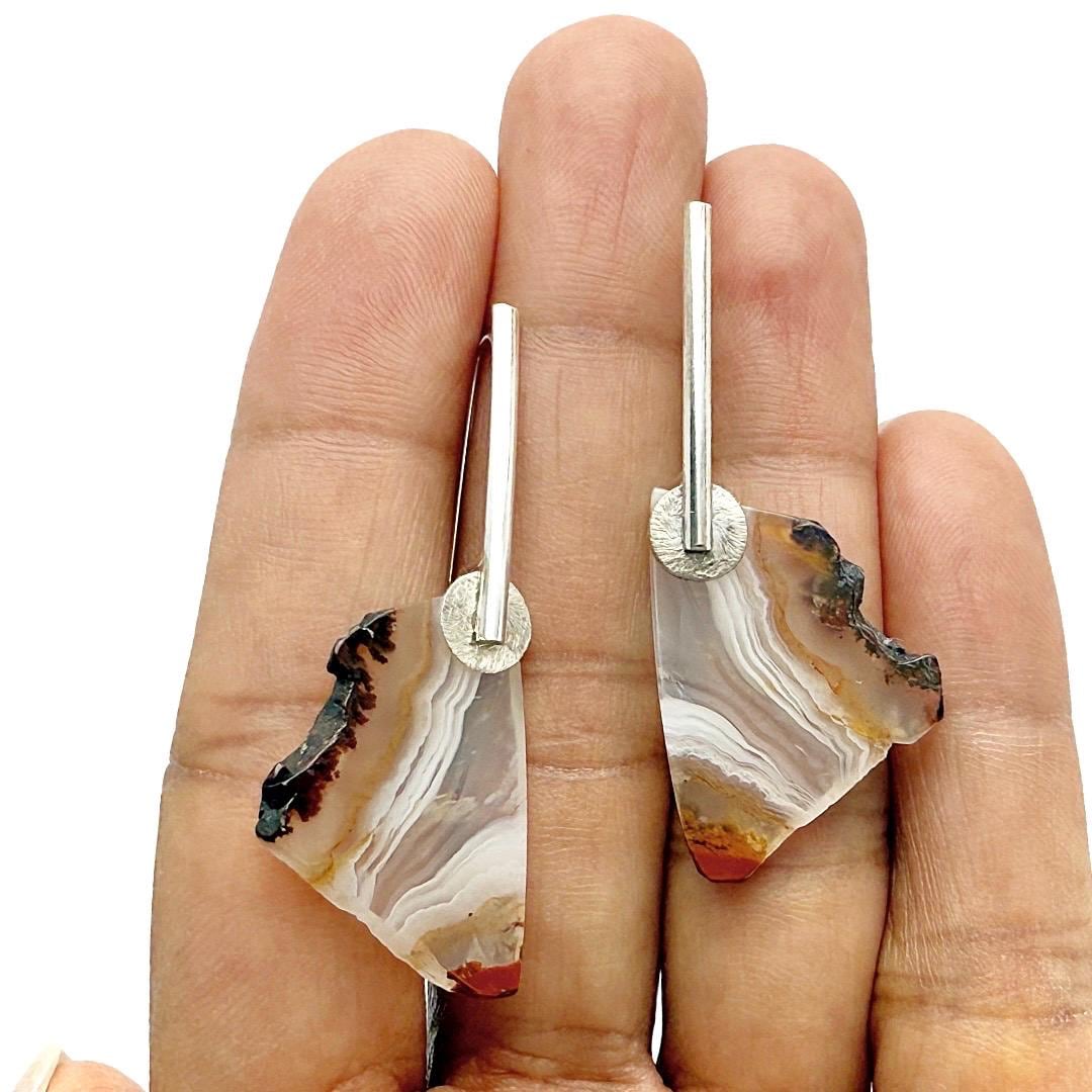 These one-of-a-kind earrings celebrate the raw beauty of nature with freeform slices of striped agate, each uniquely banded in deep reds, soft grays, and sheer whites. Their edges remain naturally roughhewn, while the softly satin-polished surfaces reveal the stone’s quiet luminosity. Suspended simply from my hand-forged sterling silver barre ear wires, which are highlighted with small corrugated sterling silver discs, these earrings embody a balance between organic form and refined industrial design.