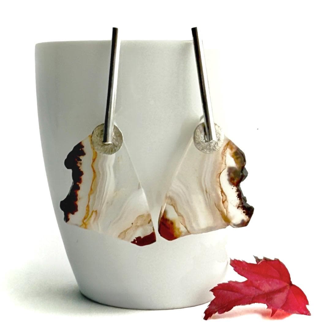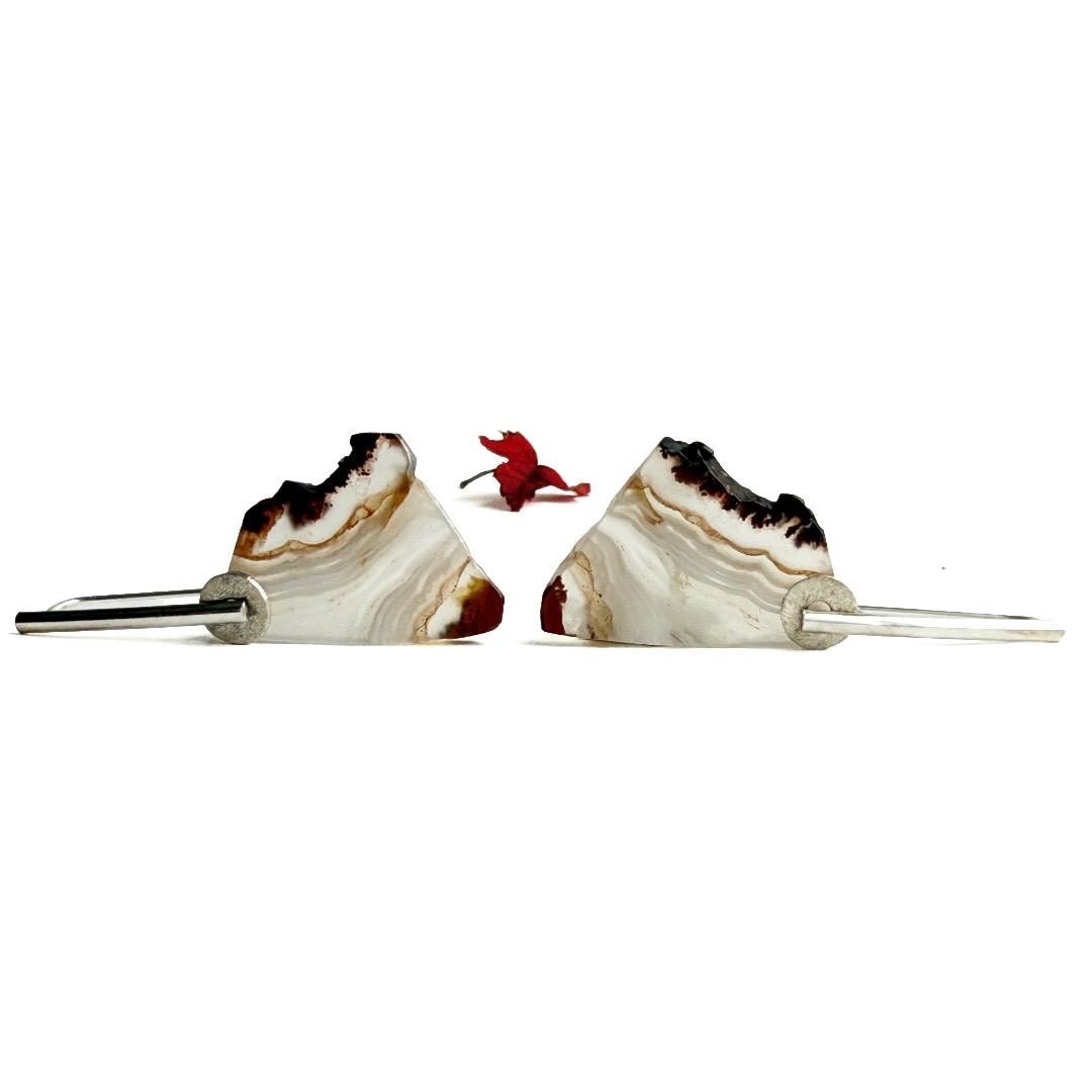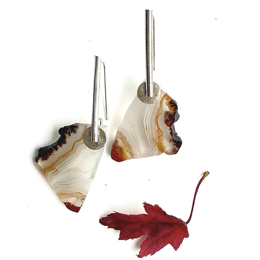 These one-of-a-kind earrings celebrate the raw beauty of nature with freeform slices of striped agate, each uniquely banded in deep reds, soft grays, and sheer whites. Their edges remain naturally roughhewn, while the softly satin-polished surfaces reveal the stone’s quiet luminosity. Suspended simply from my hand-forged sterling silver barre ear wires, which are highlighted with small corrugated sterling silver discs, these earrings embody a balance between organic form and refined industrial design.