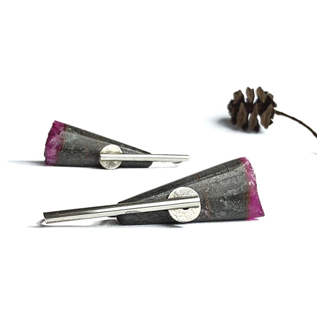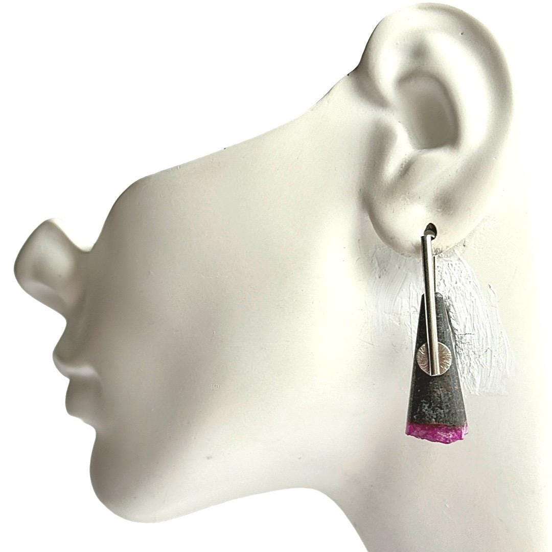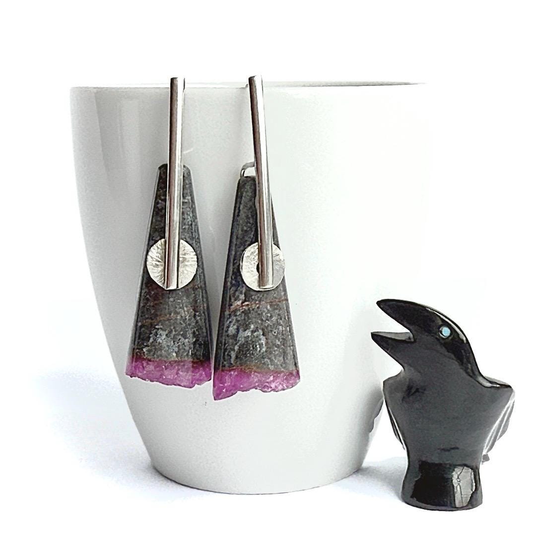 These unique earrings feature natural cone-shaped stones of gray matrix beautifully contrasted with vivid pink druzy cobalto calcite at their ends. Each gemstone displays a captivating sparkle within the druzy surface, offering a natural pop of color and texture. The stones are suspended from my hand-forged sterling silver “pendulum” ear wires, accented with small corrugated sterling discs for subtle movement and interest.