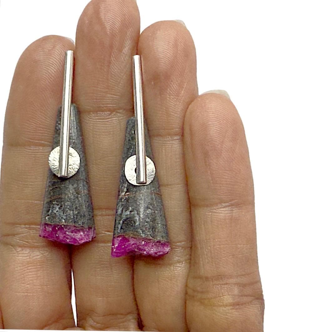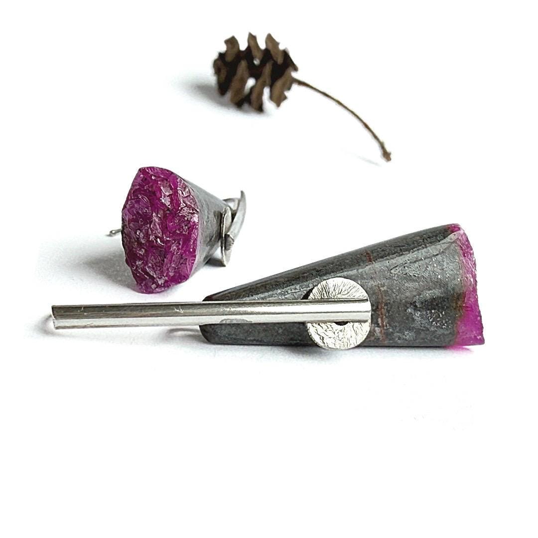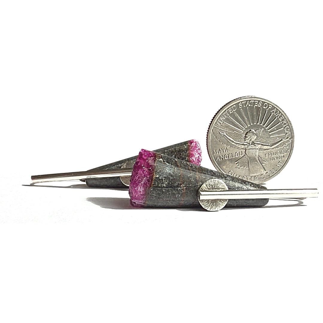 These unique earrings feature natural cone-shaped stones of gray matrix beautifully contrasted with vivid pink druzy cobalto calcite at their ends. Each gemstone displays a captivating sparkle within the druzy surface, offering a natural pop of color and texture. The stones are suspended from my hand-forged sterling silver “pendulum” ear wires, accented with small corrugated sterling discs for subtle movement and interest.