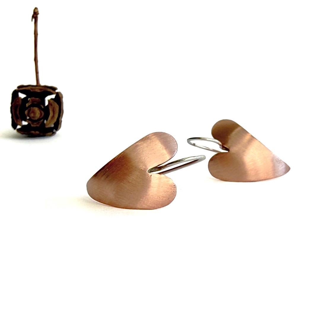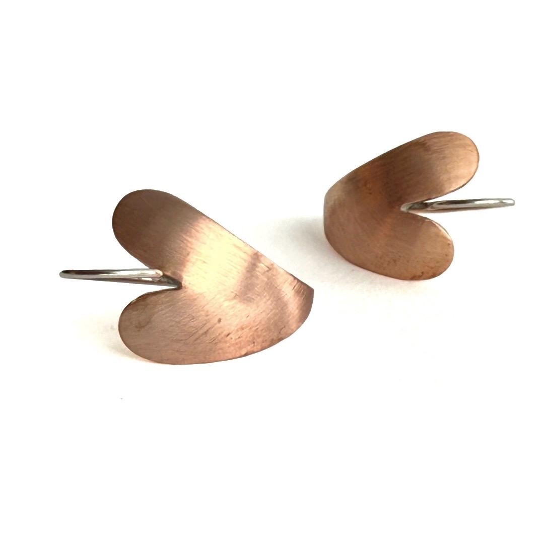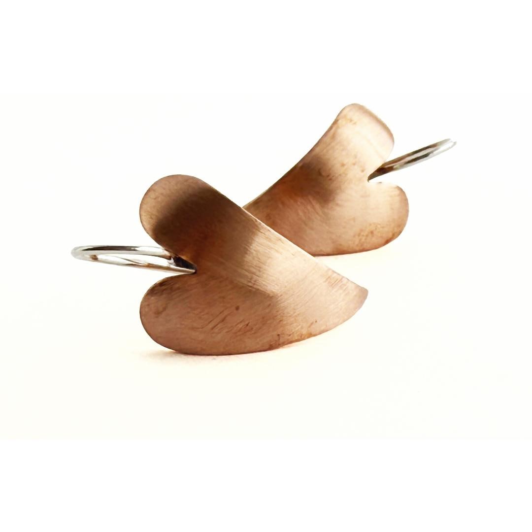 Embark on a journey of charm and whimsy with these “Gemma” Copper Heart Earrings, where hand-textured copper meets playful, modern design. Each earring features a hand-brushed asymmetrical heart, delicately suspended from curvy bright sterling silver ear wires, creating a lightweight and eye-catching statement. These earrings fuse the warmth of copper with the timeless shine of sterling silver, making them versatile for everyday wear or special occasions. Slight variations in texture and color are natural and highlight the handcrafted, artisan nature of each pair.