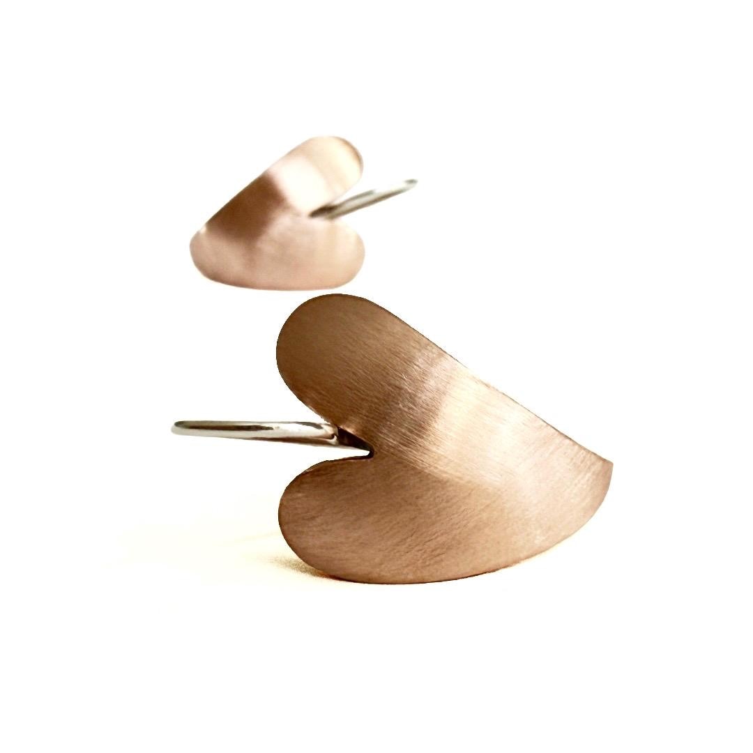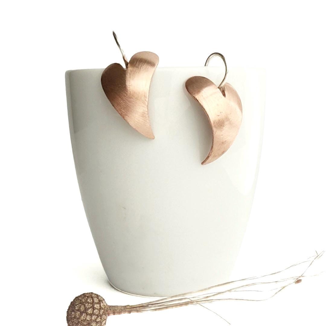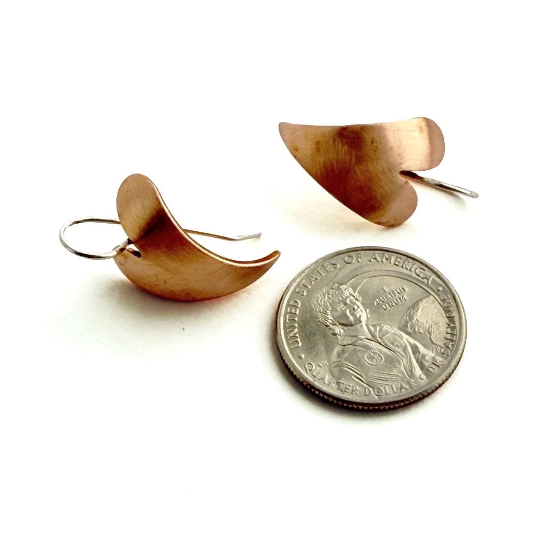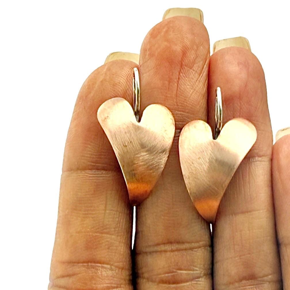Embark on a journey of charm and whimsy with these “Gemma” Copper Heart Earrings, where hand-textured copper meets playful, modern design. Each earring features a hand-brushed asymmetrical heart, delicately suspended from curvy bright sterling silver ear wires, creating a lightweight and eye-catching statement. These earrings fuse the warmth of copper with the timeless shine of sterling silver, making them versatile for everyday wear or special occasions. Slight variations in texture and color are natural and highlight the handcrafted, artisan nature of each pair.
