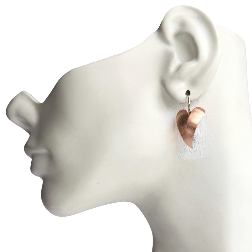 Embark on a journey of charm and whimsy with these “Gemma” Copper Heart Earrings, where hand-textured copper meets playful, modern design. Each earring features a hand-brushed asymmetrical heart, delicately suspended from curvy bright sterling silver ear wires, creating a lightweight and eye-catching statement. These earrings fuse the warmth of copper with the timeless shine of sterling silver, making them versatile for everyday wear or special occasions. Slight variations in texture and color are natural and highlight the handcrafted, artisan nature of each pair.