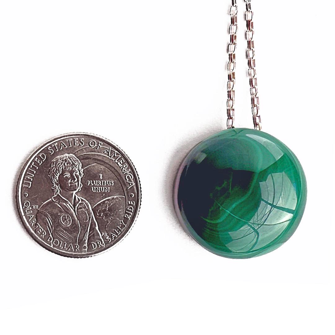 This one-of-a-kind slide necklace features a smooth polished 1-inch disk of deep green Malachite. This simple yet chic pendant "floats" on a fine sterling silver chain and is finished with a small solid sterling silver lobster claw clasp. It’s available in your choice of 18” or 20” lengths—please select from the dropdown menu. Kindly allow four (4) business days for completion prior to shipping. Coordinating earrings are available in the shop! Pendant Dimensions: 1 inch in diameter x 5/8” thick at thickest point