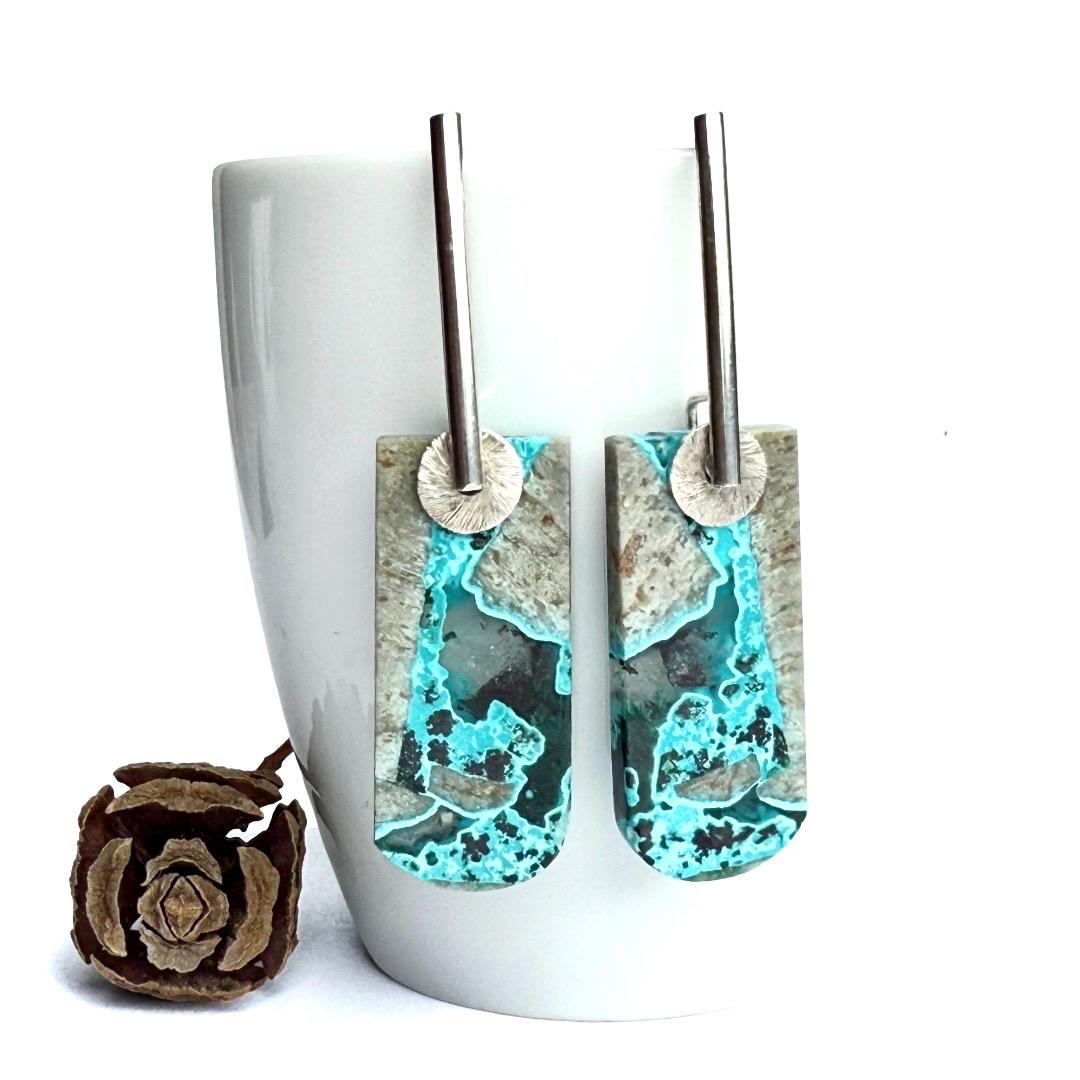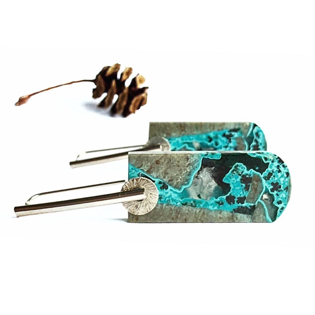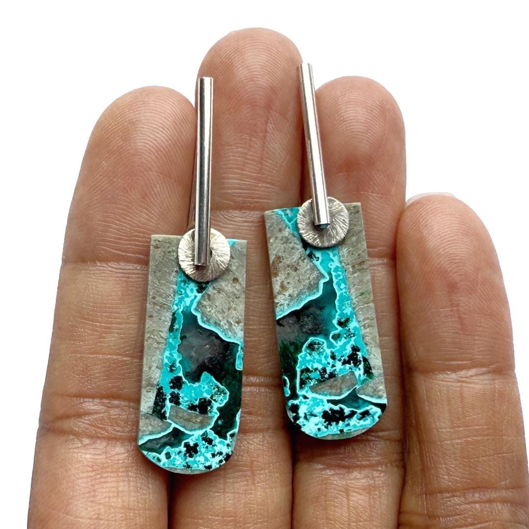 Thoughtful Pricing. Each pair of earrings is handcrafted from individually selected Chrysocolla slices, chosen for their unique color layering and serene, sea-like character. The sterling silver components are forged and finished by hand, giving a contemporary edge to these organic stones. Pricing reflects the rarity of stabilized Chrysocolla, the artisan metalwork, and the time and precision involved in crafting a balanced, graceful pair. It also includes complimentary domestic shipping and gift-ready presentation, ensuring these earrings arrive beautifully packaged and ready to enjoy.