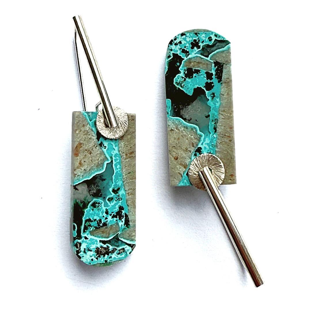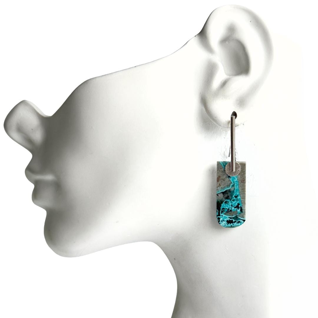 These serene, one-of-a-kind earrings feature slim, shield-shaped slices of natural Chrysocolla—each resembling a tranquil oceanic landscape. Swirled with deep marine blues and subtle semi-translucent pools against a soft concrete-toned matrix, each stone captures the quiet poetry of water meeting earth. The satin-finished surfaces lend a refined, understated sheen, while my hand-forged sterling silver “barre” ear wires and corrugated silver accents complete the composition with modern grace.