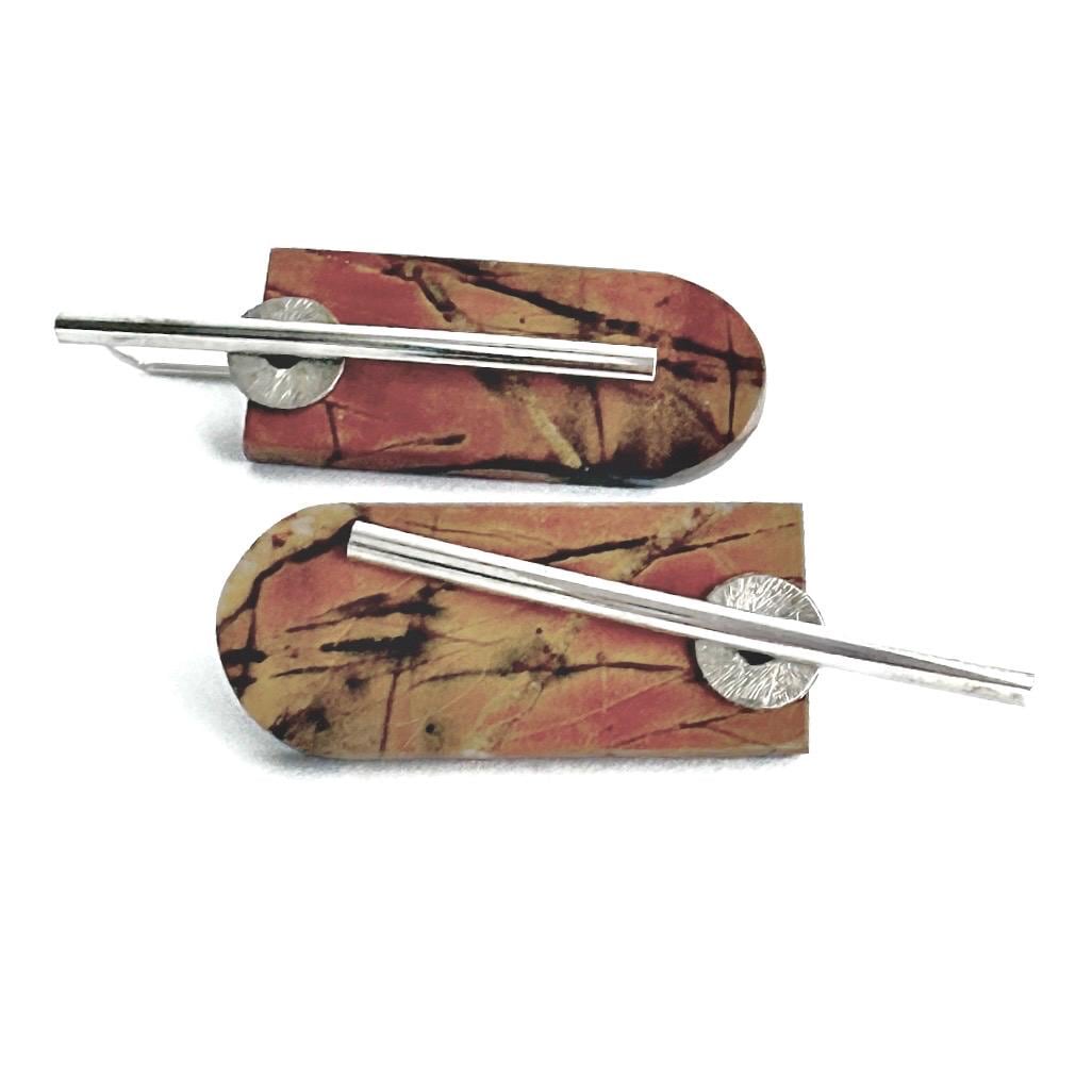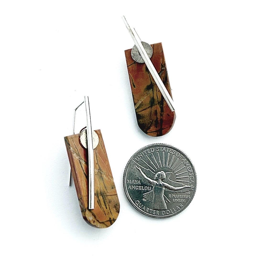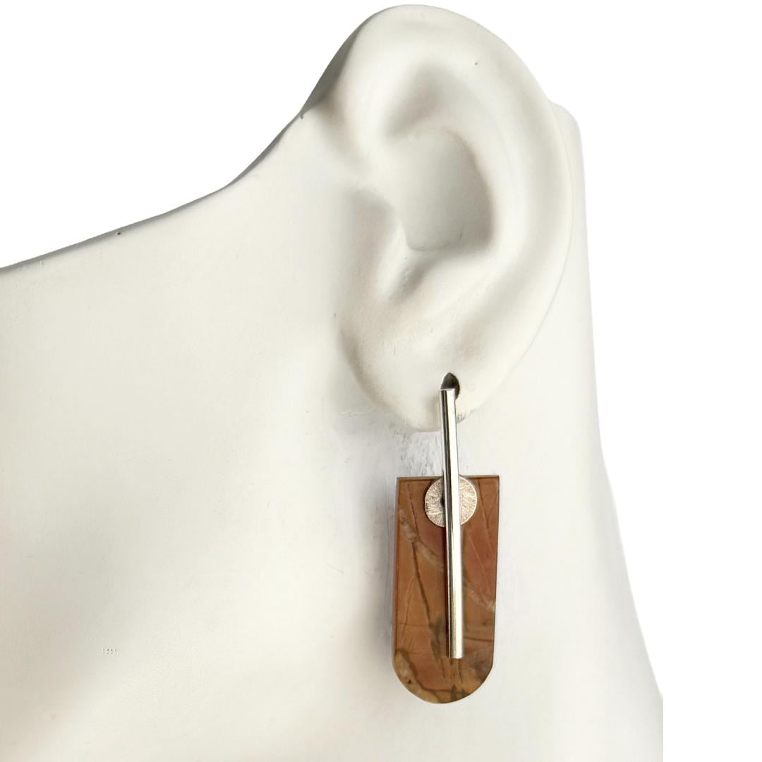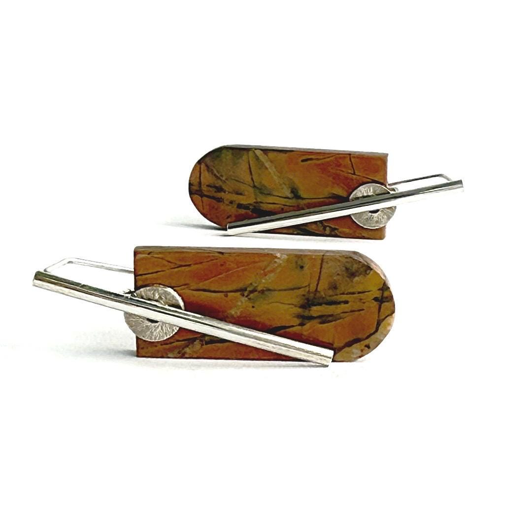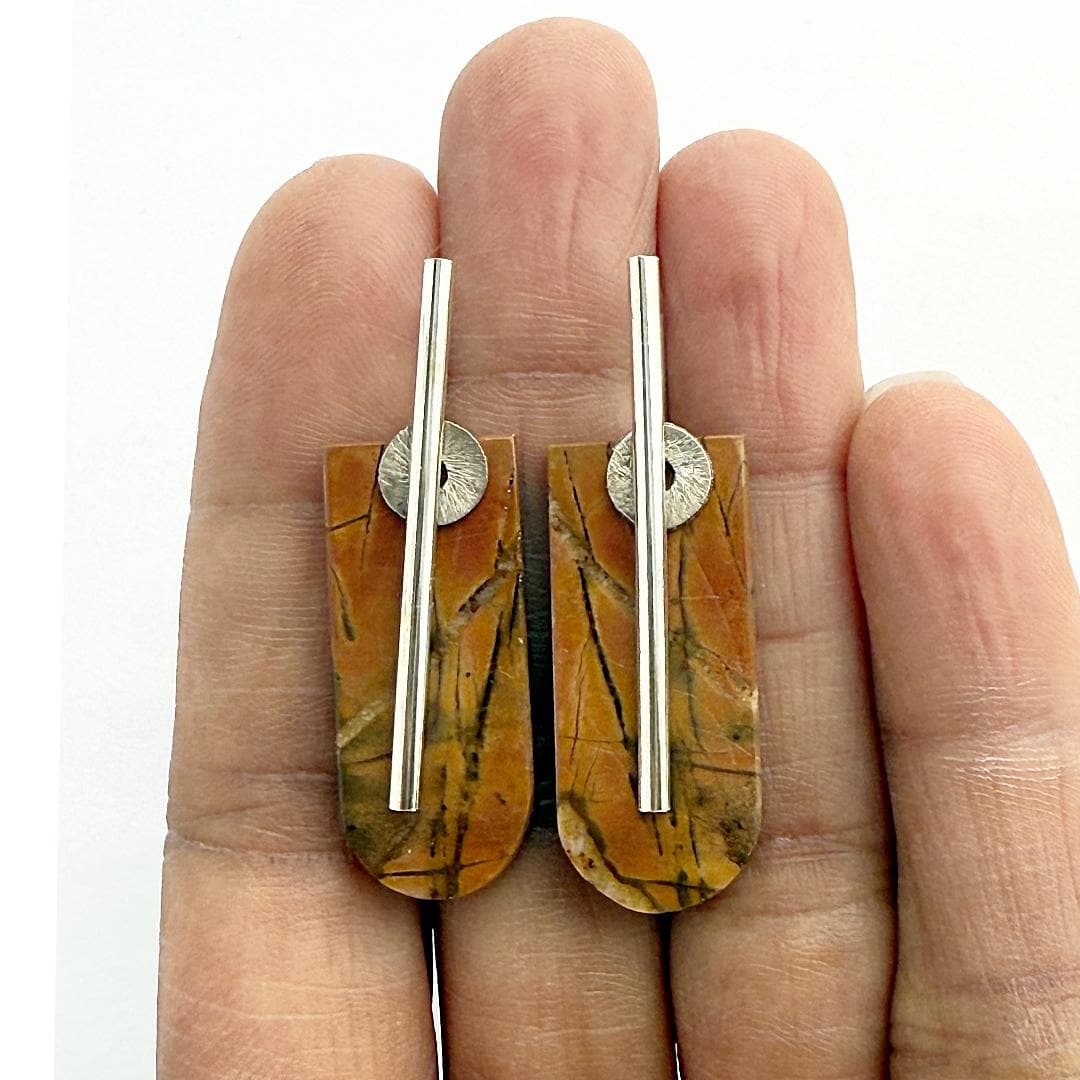 These striking earrings showcase shield-shaped tablets of creek jasper in soft shades of orange, tan, and subtle olive. Their satin finish gives a gentle, natural glow (not high-shine), emphasizing the earthy striations within the stone. Each tablet is simply presented on my hand-forged organic “barre” style sterling earwires, accented with small corrugated sterling silver discs for a refined industrial look. Bold yet refined, these earrings measure approximately 1-3/4 inches long by ½ inch wide.