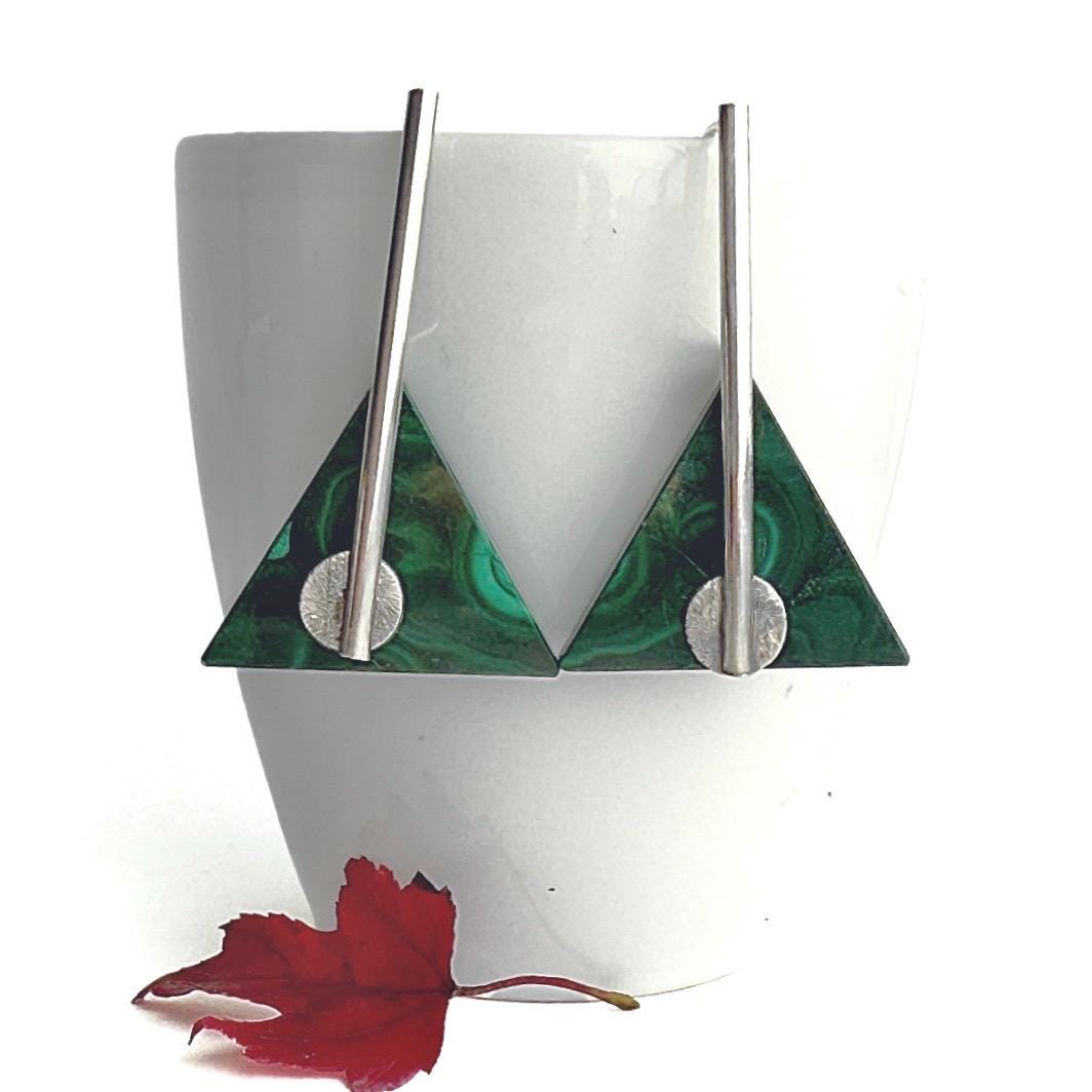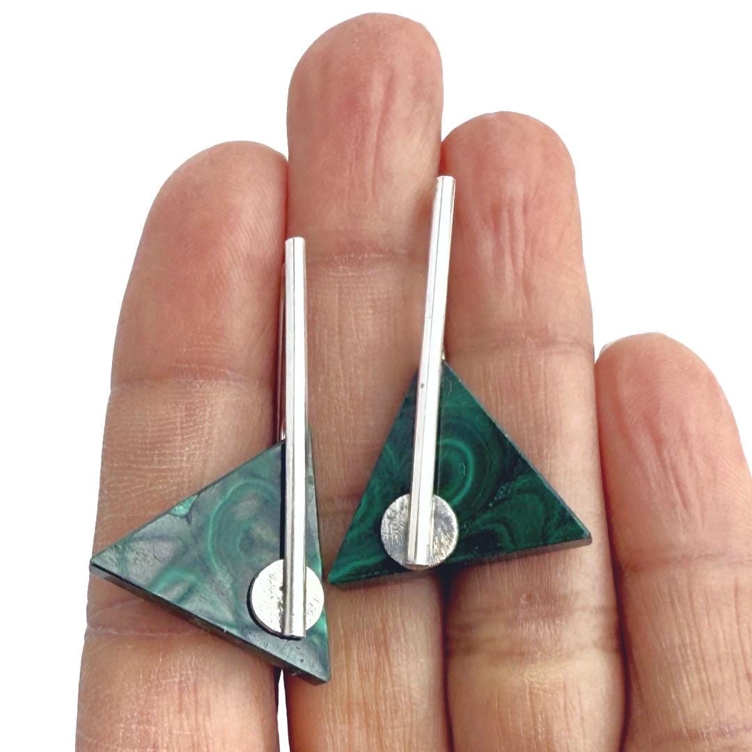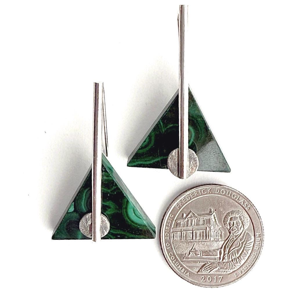 These chic modern earrings feature satin-finished triangles of malachite, adorned with flowing greens. the back of one stone is mostly matrix. They elegantly dangle on my hand-forged sterling silver "pendulum" ear wires which are finished with small corrugated sterling silver discs. Measuring 1-1/2 inches long and 3/4 inch wide, these chic earrings are a stylish addition to your collection.