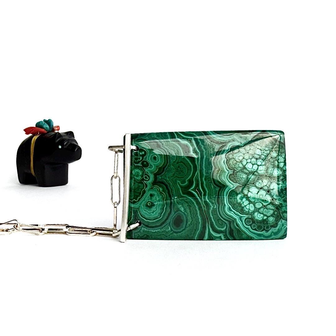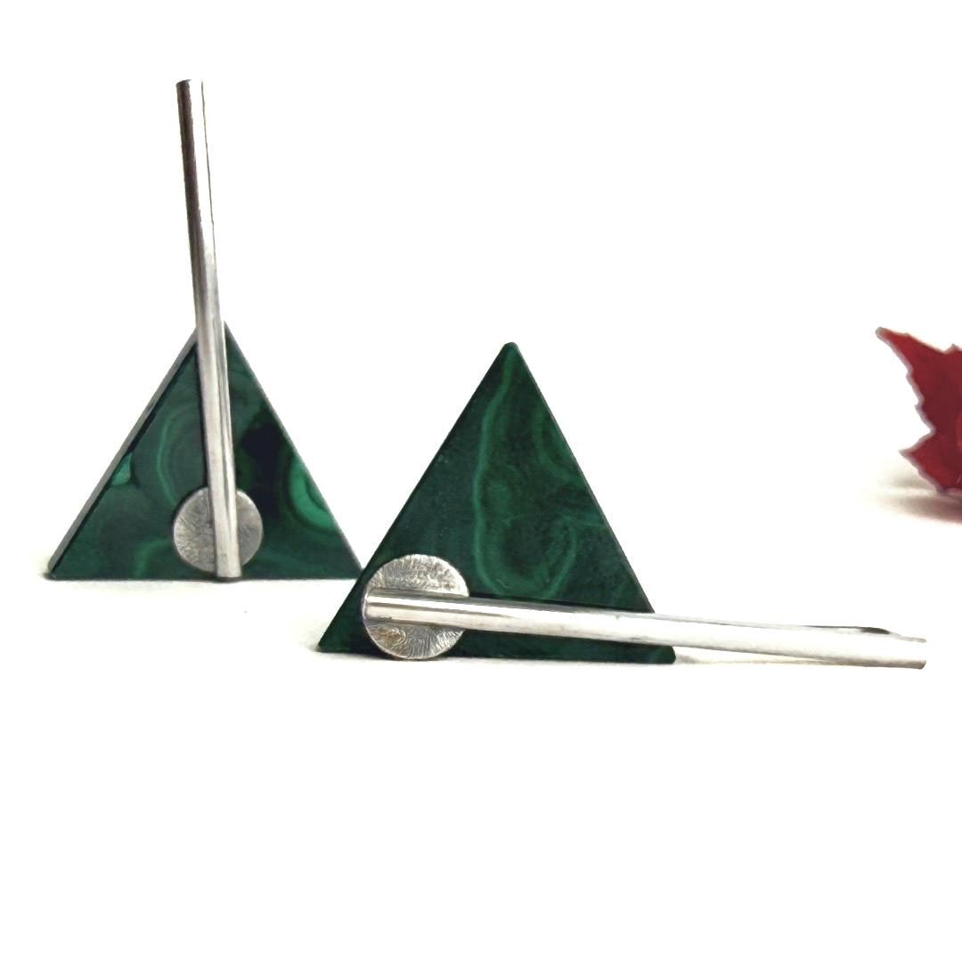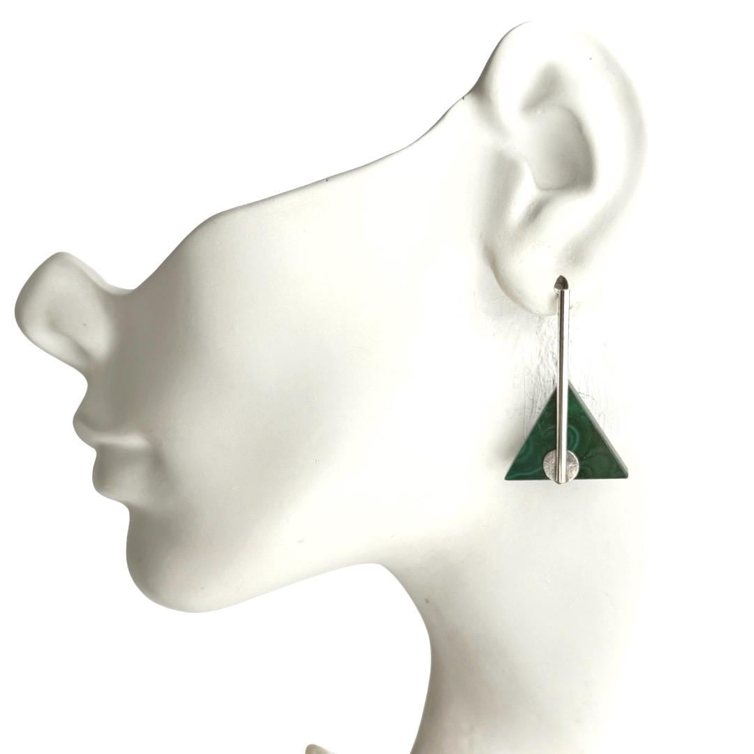 These chic modern earrings feature satin-finished triangles of malachite, adorned with flowing greens. the back of one stone is mostly matrix. They elegantly dangle on my hand-forged sterling silver "pendulum" ear wires which are finished with small corrugated sterling silver discs. Measuring 1-1/2 inches long and 3/4 inch wide, these chic earrings are a stylish addition to your collection.