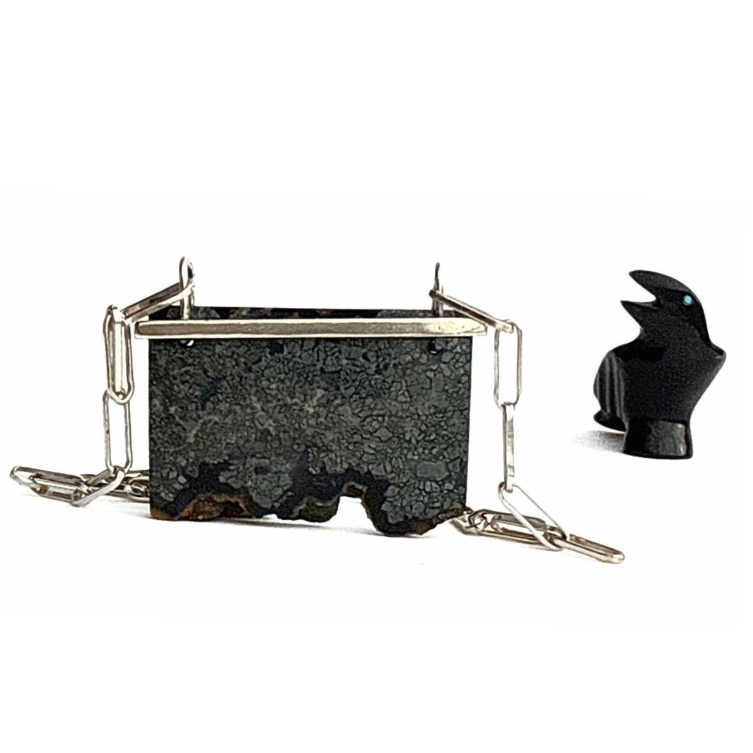 This chic, one-of-a-kind necklace features a rare natural slice of Marcasite, edged with a raw ribbon of golden Pyrite druzy (Fool’s Gold) at its base. The contrast between the stone’s silvery metallic sheen and brassy gold sparkle creates a luminous interplay of light and texture. Smoothly polished surfaces highlight the stone’s structure, while the natural golden druzy edge remains raw and radiant — a beautiful balance of refinement and earth-born character. The pendant is simply suspended from my hand-forged sterling silver “barre” bail and centered on a solid sterling silver paperclip link chain, and finished with a sterling toggle clasp. Elegant, modern, and quietly powerful, this necklace celebrates the meeting point between polish and raw energy. Coordinating earrings are available in the shop! FINISHED TO ORDER: please choose your chain length from the drop-down menu and allow up to four (4) business days prior to shipment. Details:
