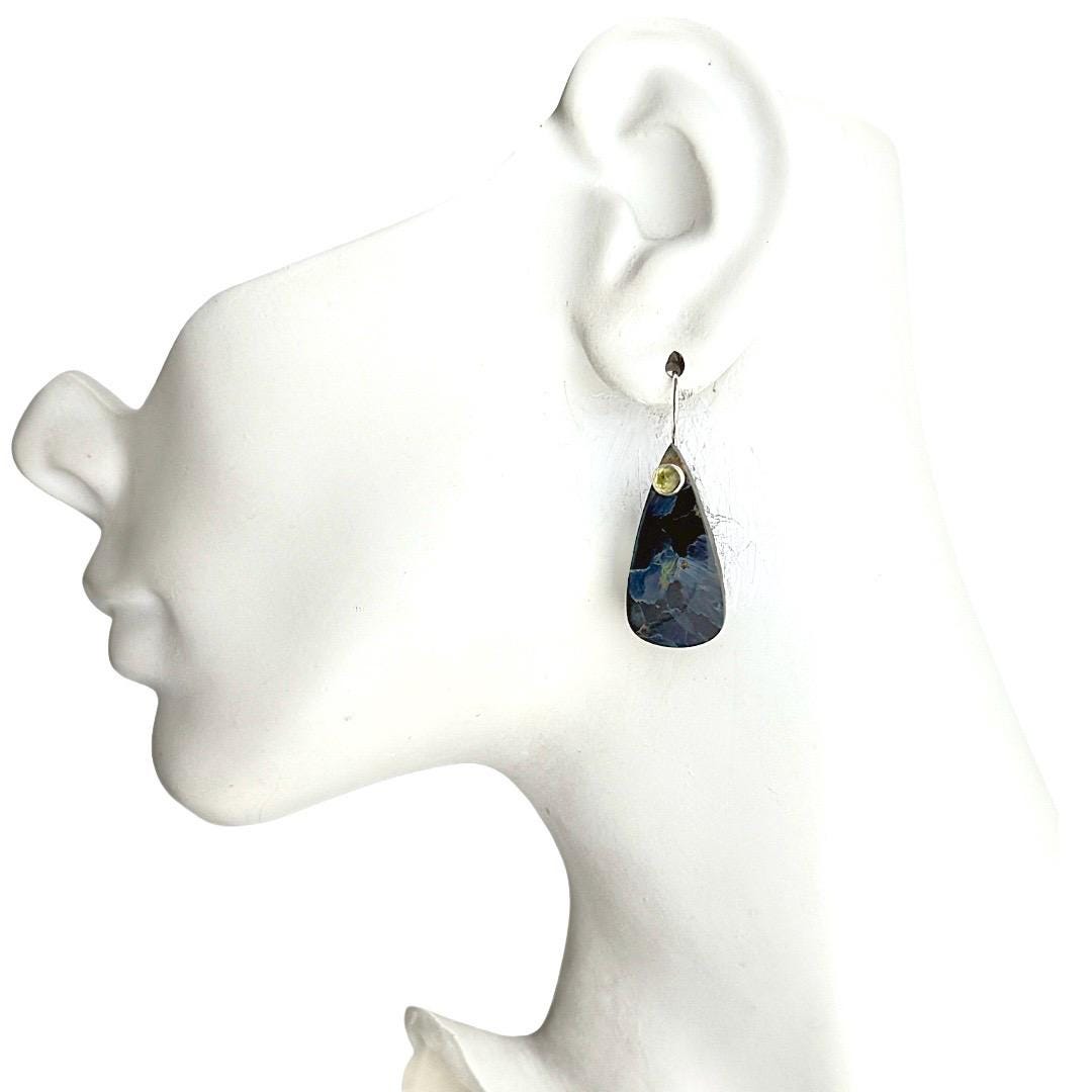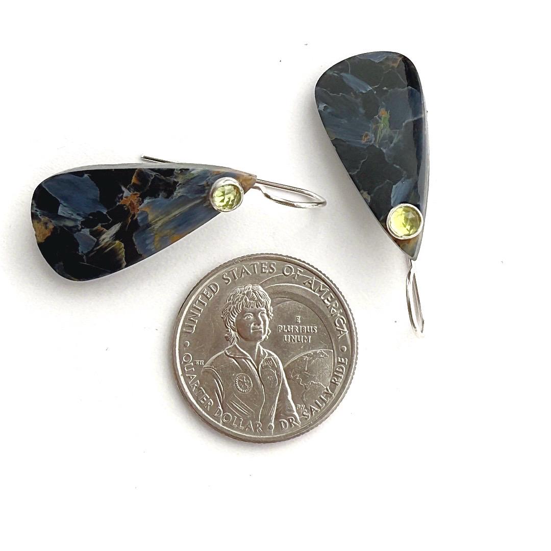 These one-of-a-kind earrings showcase rich navy teardrops of natural Pietersite. Each stone reveals subtle golden or silvery chatoyancy characteristic of this material. The front surfaces are softly polished to a satin glow, while the reverse remains natural and unpolished and organic. These gems are gracefully suspended from my signature hand-forged sterling silver “button” ear wires, accented with bright green faceted peridots for a refreshing touch of color.