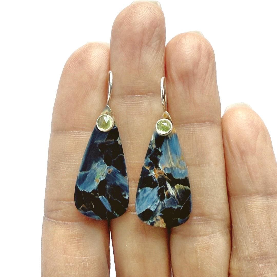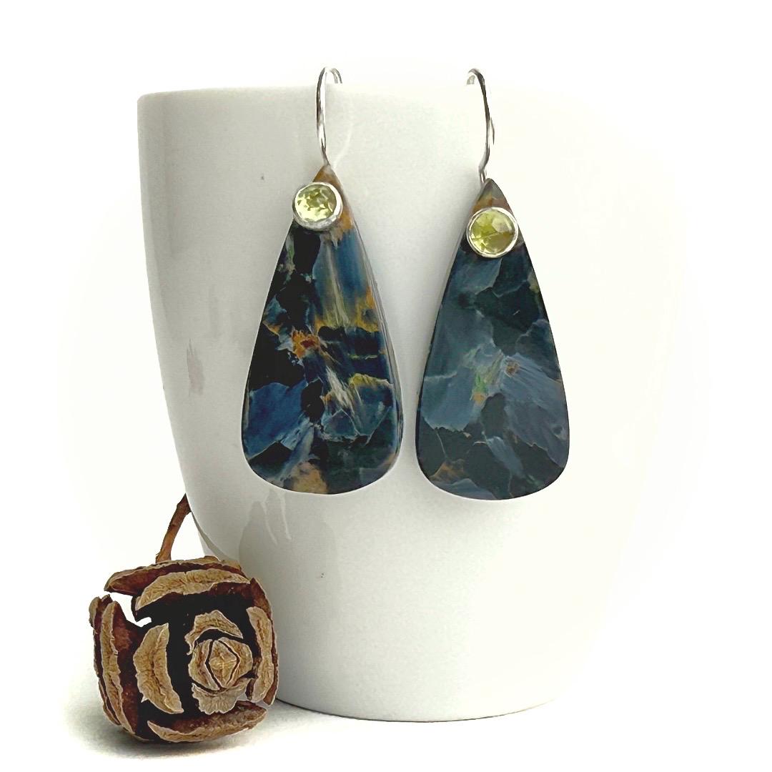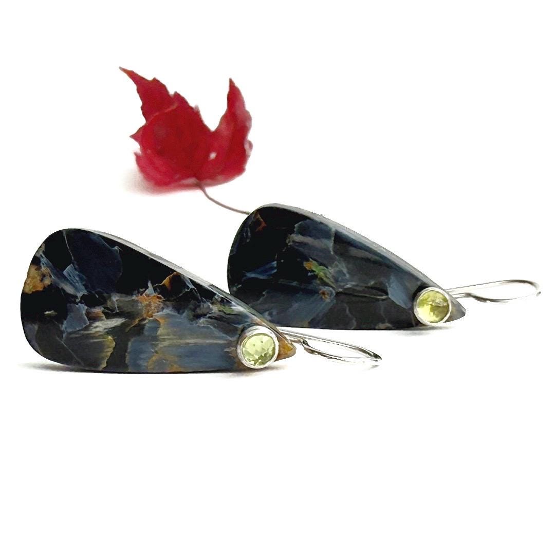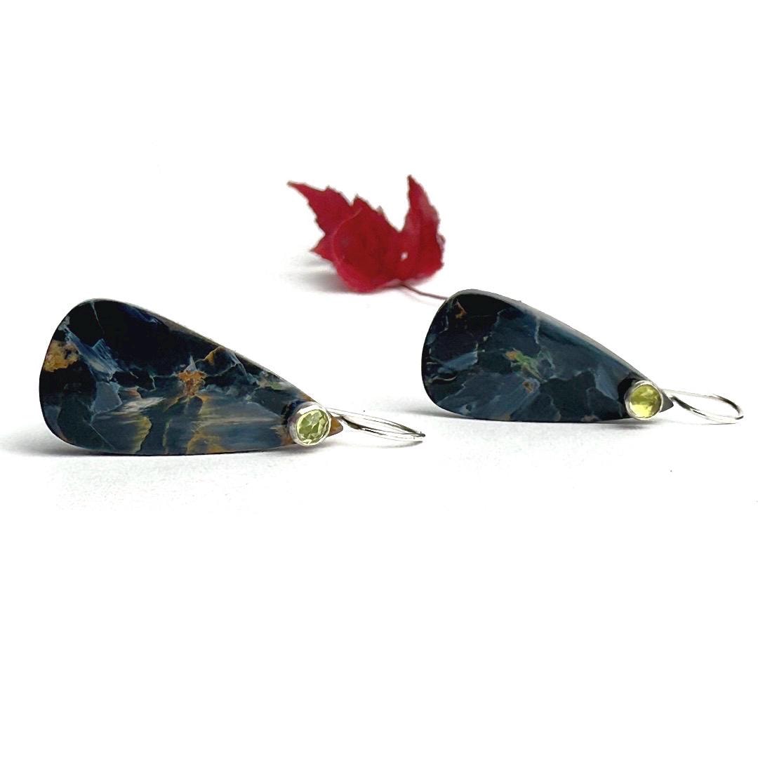 Thoughtful Pricing. These earrings are individually crafted from hand-selected Pietersite teardrops, chosen for their exceptional movement of color and natural energy. Each pair is carefully assembled with hand-forged sterling components, accented with genuine rose-cut peridot for a refreshing balance. Pricing reflects the rarity of Pietersite, the mixed-metal hand fabrication, and the inclusion of complimentary domestic shipping and a gift-ready box—representing artisan craftsmanship at an accessible value.