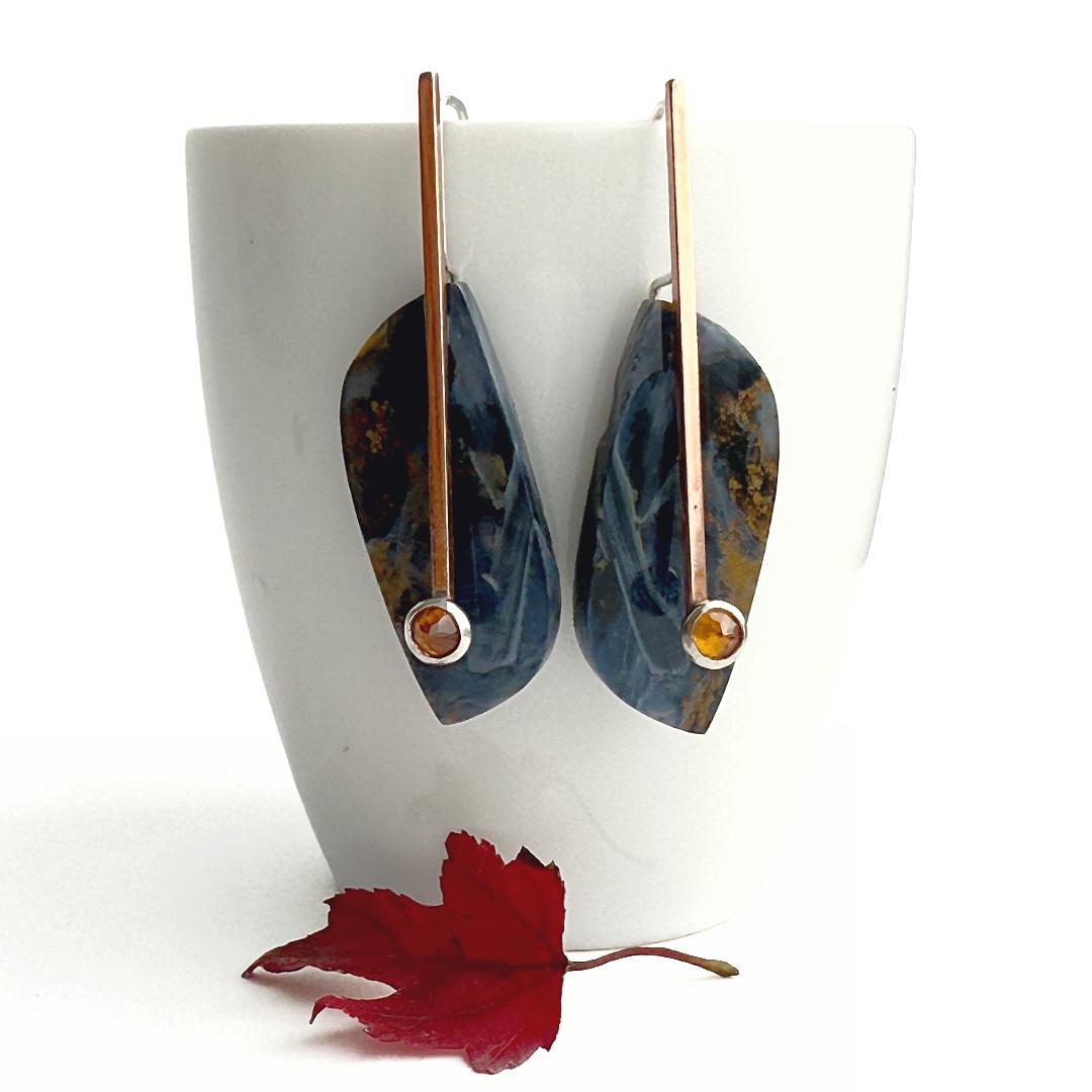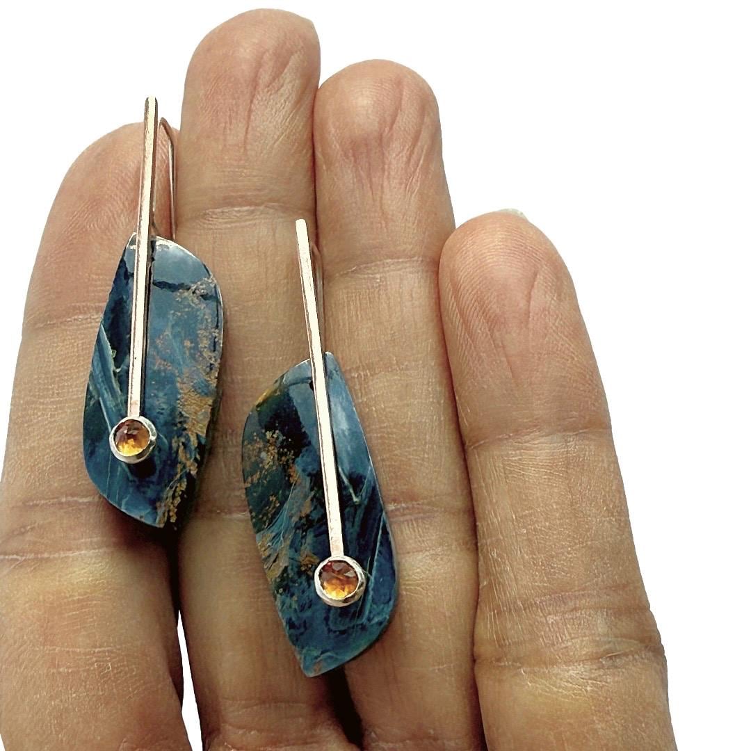 Thoughtful Pricing. These earrings are individually crafted from hand-selected Pietersite teardrops, chosen for their exceptional movement of color and natural energy. Each pair is carefully assembled with hand-forged sterling and copper components, accented with genuine rose-cut carnelian for warmth and balance. Pricing reflects the rarity of Pietersite, the mixed-metal hand fabrication, and the inclusion of complimentary domestic shipping and a gift-ready box—representing artisan craftsmanship at an accessible value.