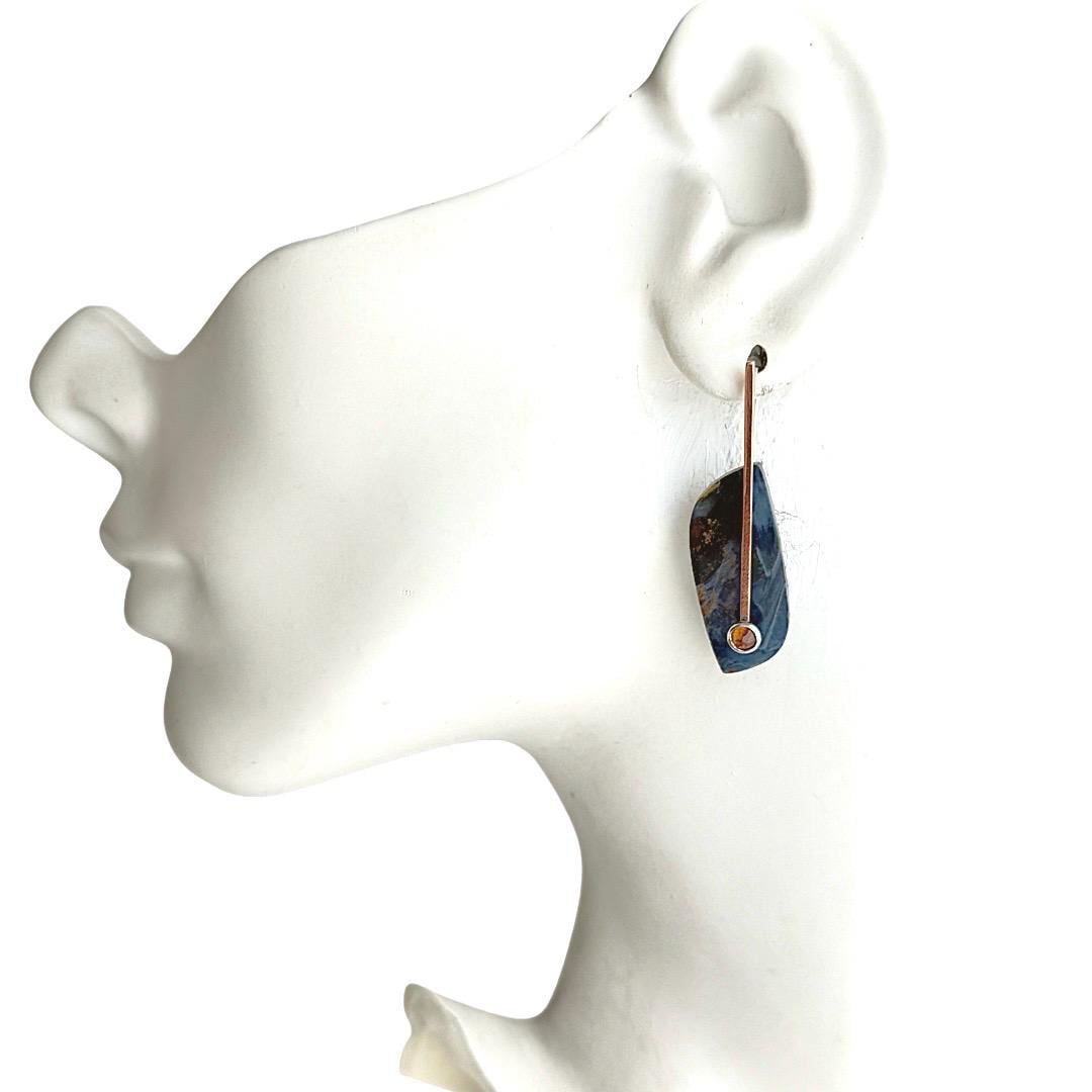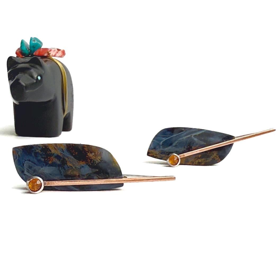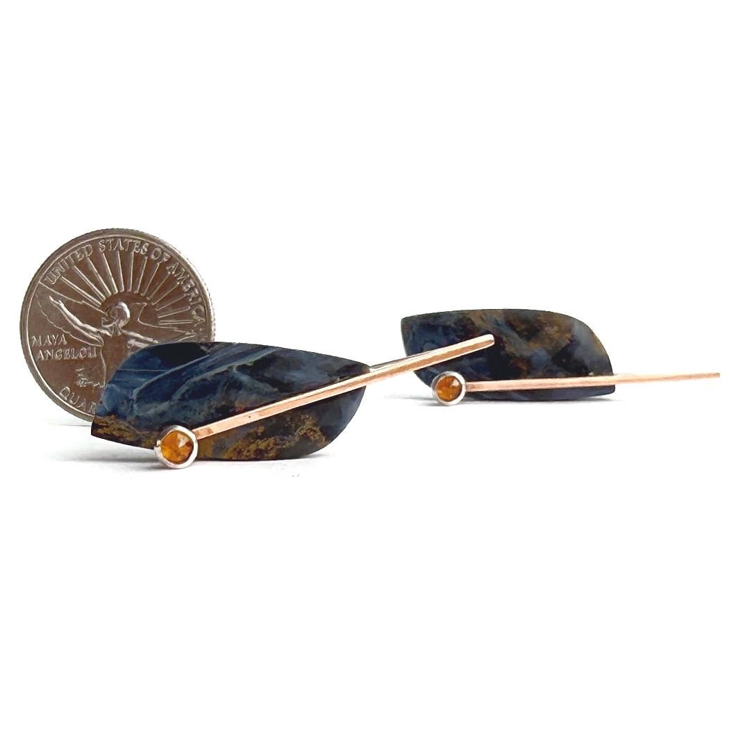 These one-of-a-kind earrings showcase freeform slices of natural Pietersite—each slice revealing mesmerizing swirls of deep navy and bronze, alive with warm flashes of orange. The stones feature a softly satin-finished face and a naturally unpolished reverse, honoring the raw, untamed energy of this rare gemstone. Suspended from my signature hand-forged sterling silver ear wires, each earring is fronted with a slender copper “pendulum” bar and accented with a petite 4mm matte rose-cut carnelian bob, adding an earthy glow and subtle contrast to Pietersite’s stormy depths.