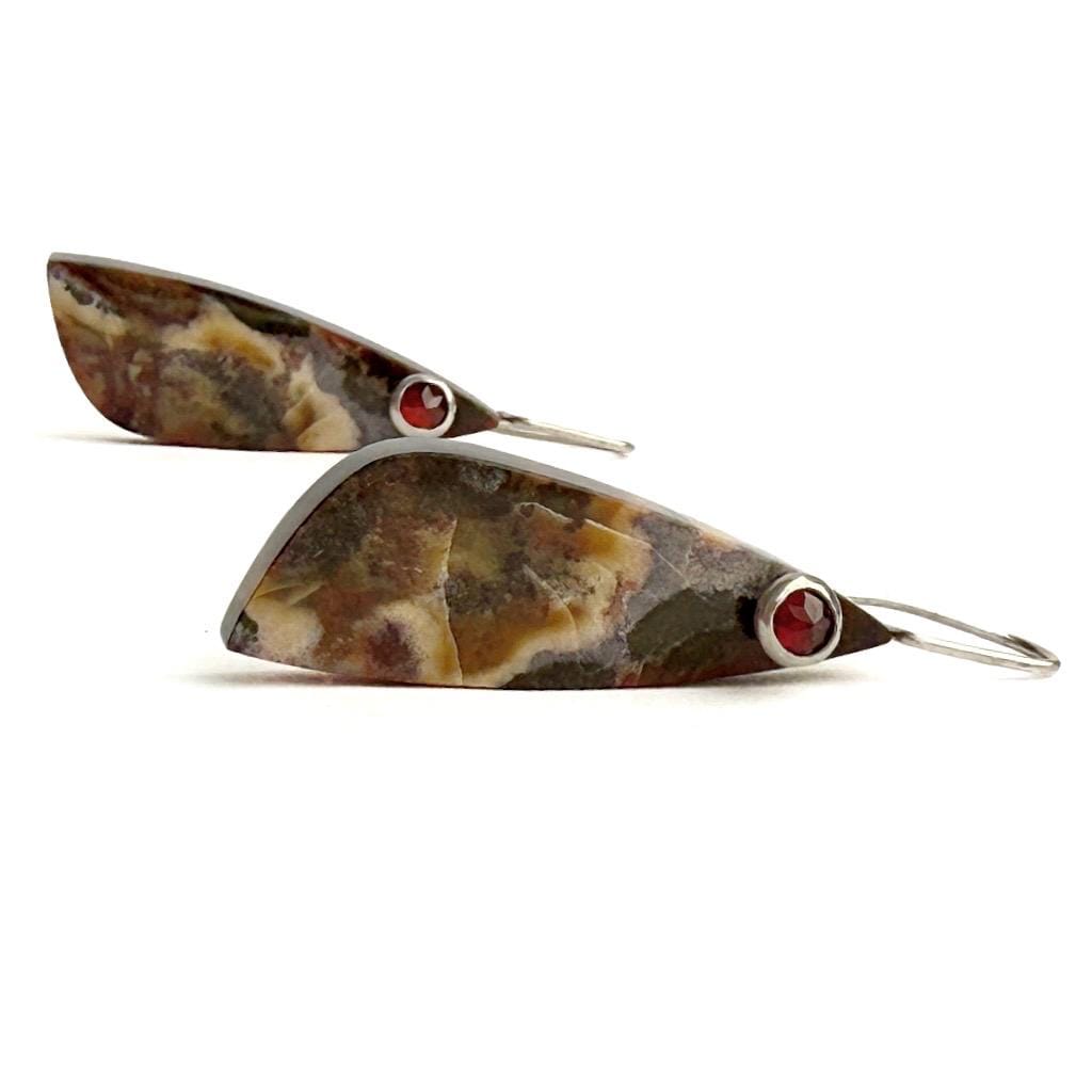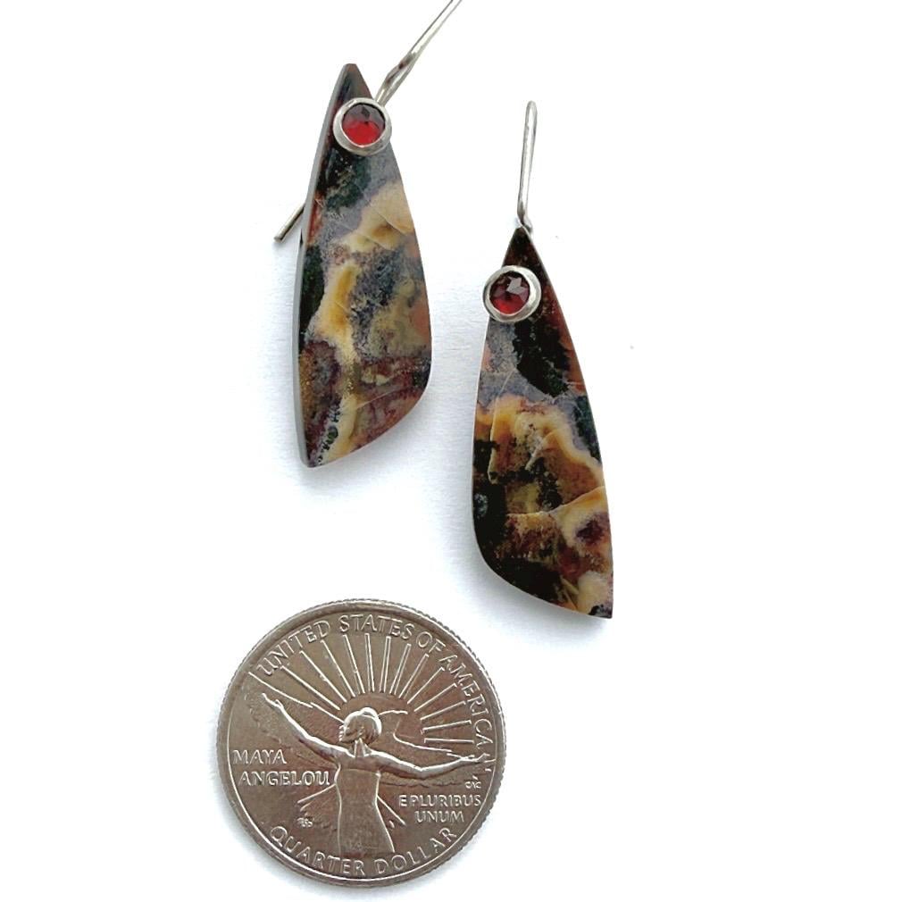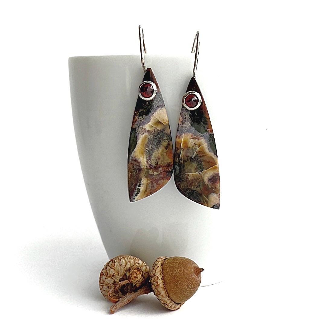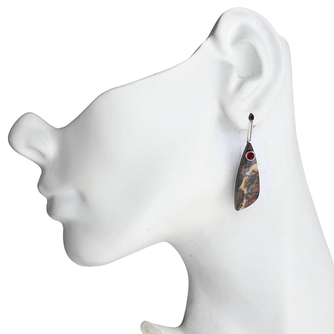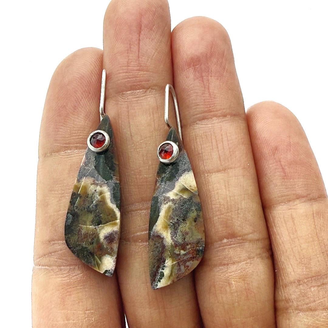 Embrace the earthy artistry of these Jasper & Garnet Earrings, featuring highly polished, free-form slices of natural jasper. Each stone reveals a painterly mix of deep chocolate, cream, tan, and warm reddish-brown tones—a palette reminiscent of desert canyons and autumn leaves. Suspended from my hand-forged sterling silver “button” ear wires, the stones are elegantly accented with 4mm faceted red garnets, whose gemmy clarity adds a vibrant pop of color and understated sophistication. Light and comfortable to wear, these earrings bring a refined, organic touch to both casual and dressy looks. Details: